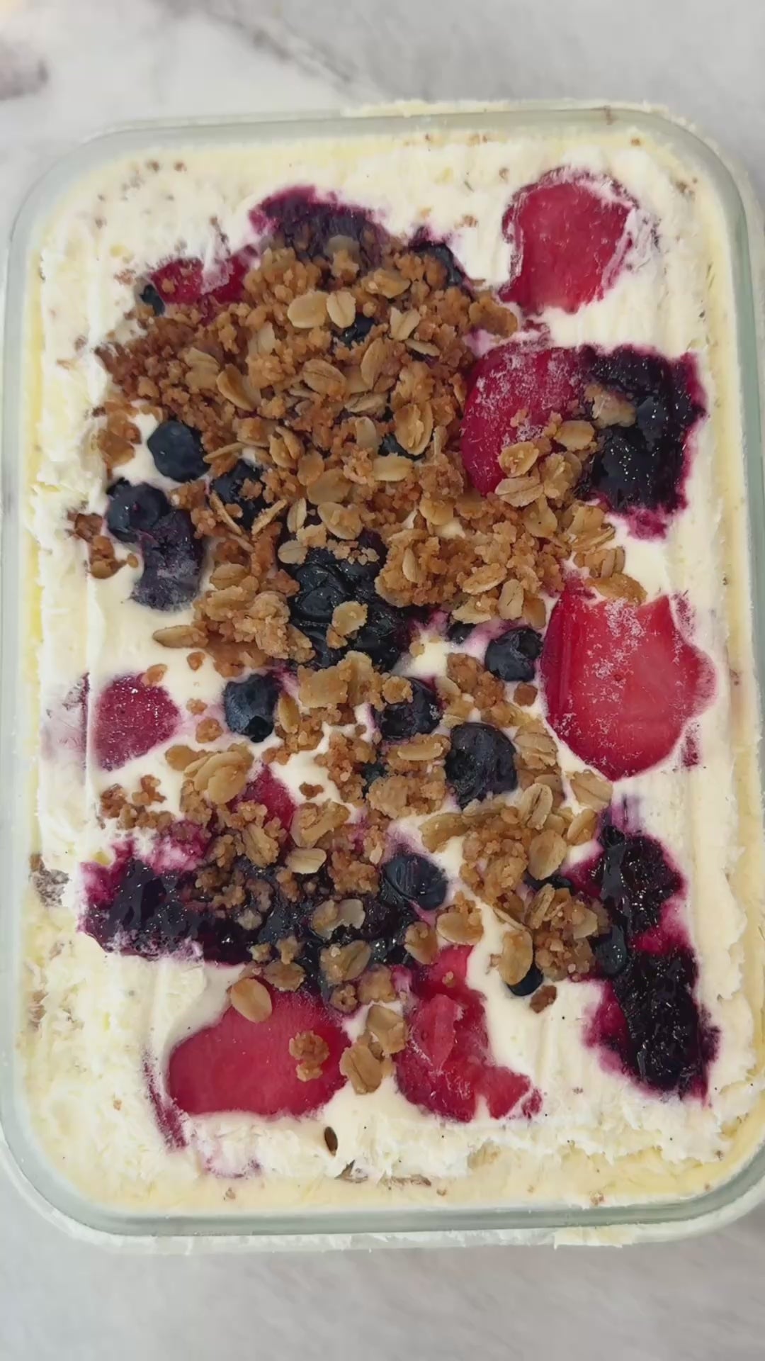 Silky vanilla bean custard layered with homemade triple berry jam, fresh strawberries, blueberries, blackberries, and buttery oat streusel. Bright, nostalgic, made for the girly who is delusional enough to believe this situationship just might work.