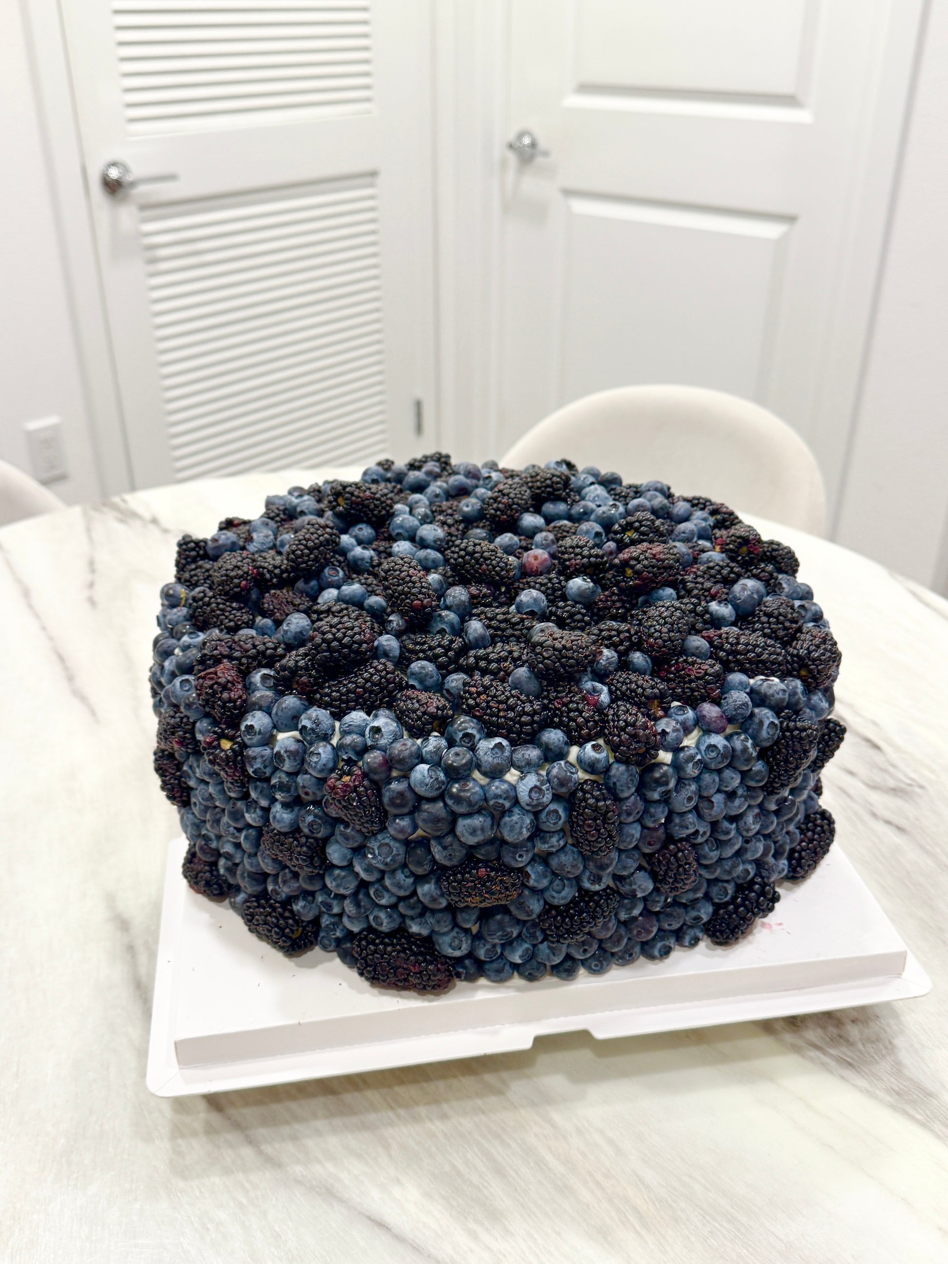 This viral sensation has over 2.2 million Tiktok views and counting. A cake envisioned by fashion & celebrity photographer Adrian Martin, this 12” diameter berry beauty features a vanilla cake and Swiss Meringue Buttercream covered in luscious blueberries and blackberries.